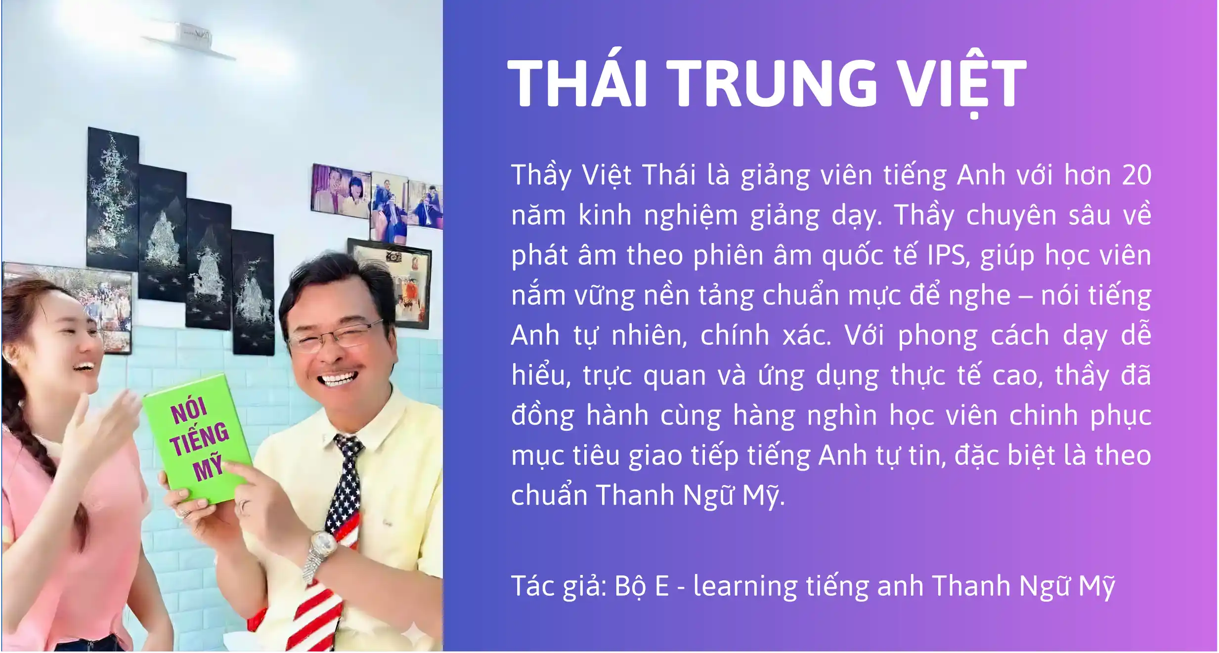 Khóa học E-learning với 21+ video bài giảng, giúp bạn luyện phát âm, giao tiếp và sử dụng thanh ngữ Mỹ tự nhiên. Khóa học online nền tảng này mang đến phương pháp dễ hiểu, hiệu quả, giúp bạn tự tin nói tiếng Anh giọng Mỹ chuẩn trong học tập, công việc và đi định cư nước ngoài.